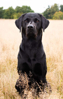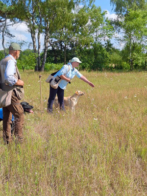 Als ich dann wieder für mein 5. Dummy an der Reihe war, konnten wir die Startnr. 1 eyewipen. Ein langes blind, den Hang schräg hinunter, stoppen, suchen, picken und retour.