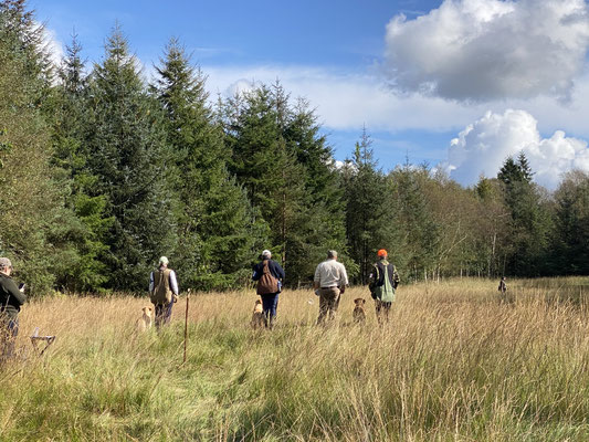 10 Hunde hatten das Vergnügen zum Drive, mussten ein wirlich mächtig langes Treiben in einem mehr als bewegten Wald mit tiefen Schluchten, und sehr vielen Bäumen über sich ergehen lassen. Im 180 Grad-Winkel schossen die Treiber hier und da Vögel, die es nach dem Treiben reinzuholen galt. Mein 4. Retrieve war eher unspektakulär. Foxy hat gut mit dem Wind gearbeitet und flugs das Dummy gebracht.