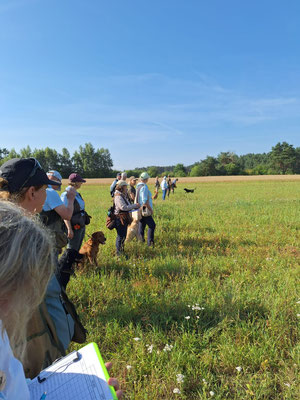 Der Trial verlief zunächst über die Wiesen, bog dann ab in Richtung Wald. Vor uns wuselten die ganze Zeit mehrere Spaniels, wir erlebten runnig rabbits und diverse Verleitungen, die die Spaniels reinholten.